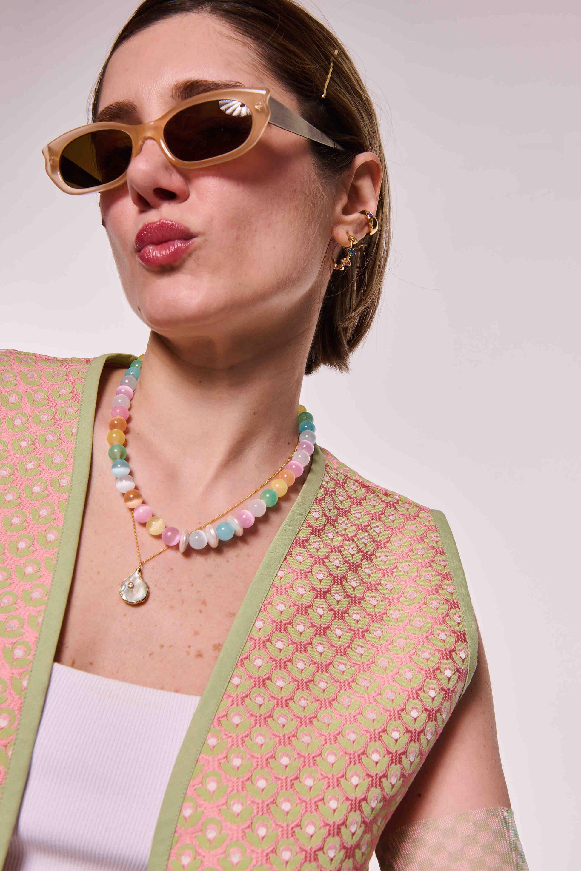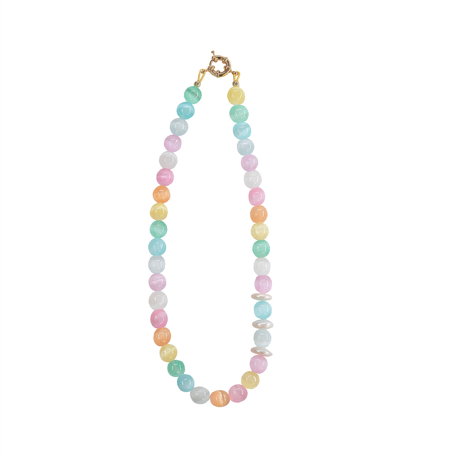 Canlı pastel tonlardaki kedigözü taşları, gün ışığını yakalarken; araya serpiştirilen yassı inciler tasarıma zarif bir denge katıyor. Stella, rengini sabah güneşinden, enerjisini yazdan alıyor.